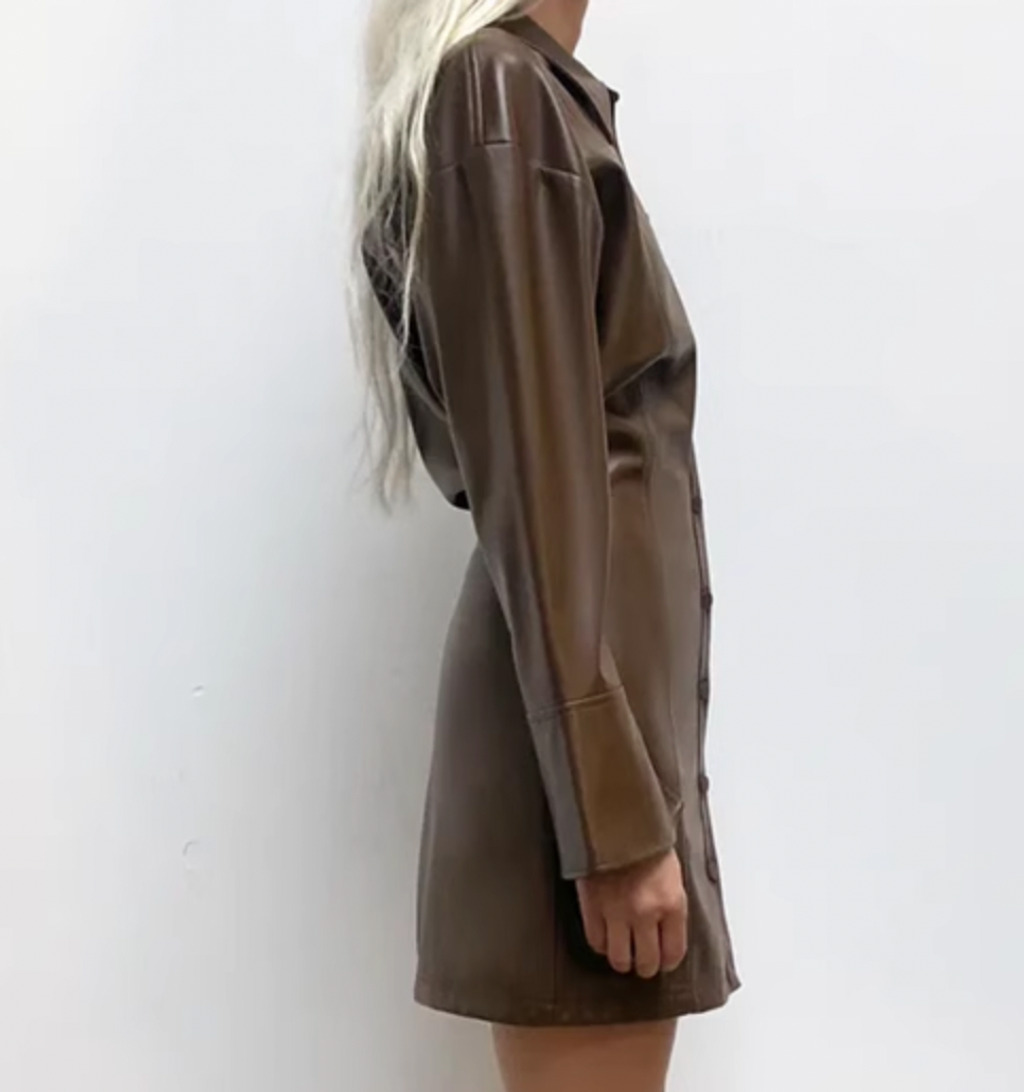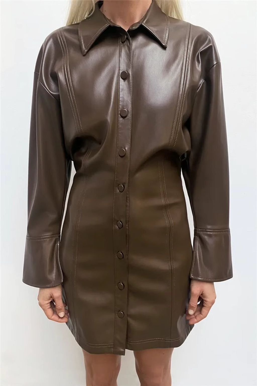 CHOCOLATE FAUX LEATHER LONG SLEEVE BLOUSE MINI DRESS