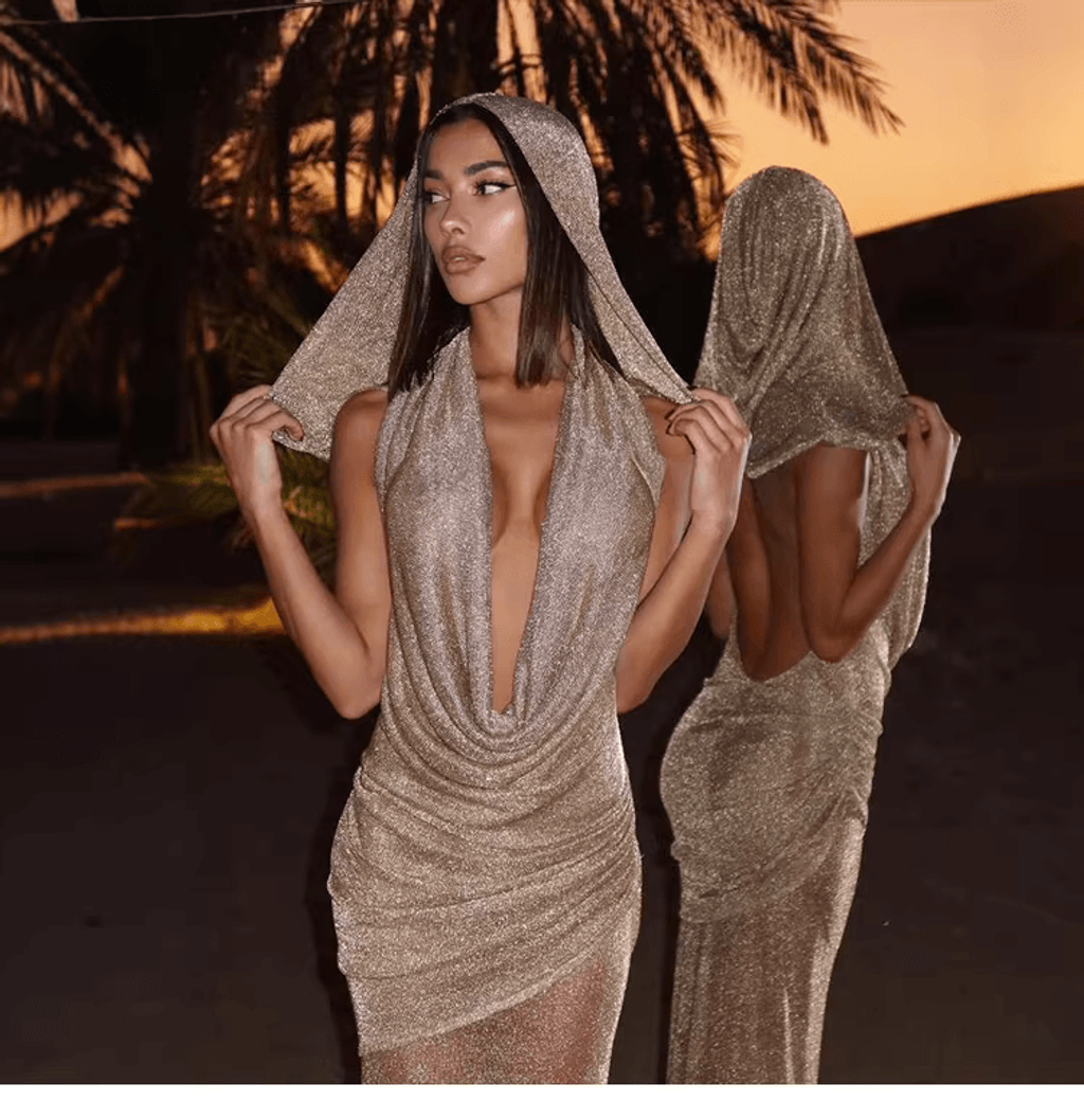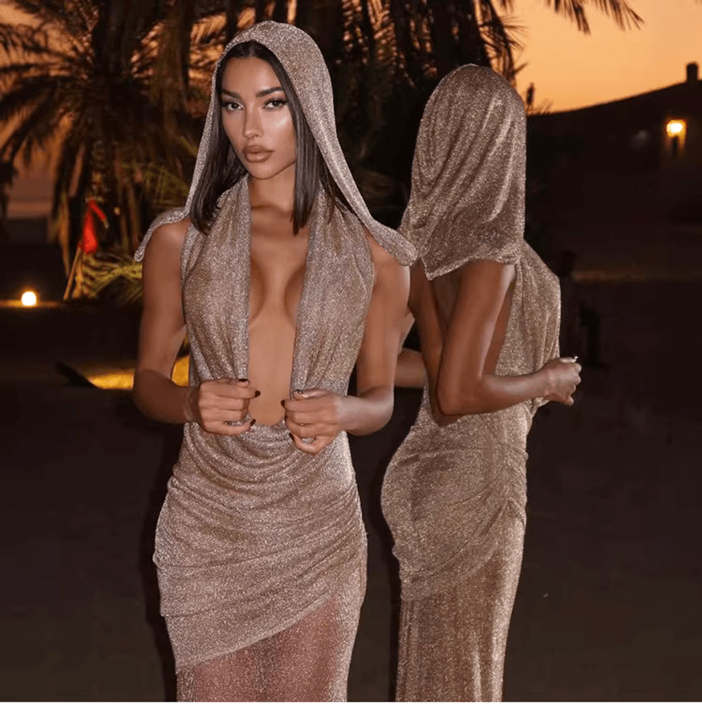 HOODIE SEQUIN MESH MAXI DRESS