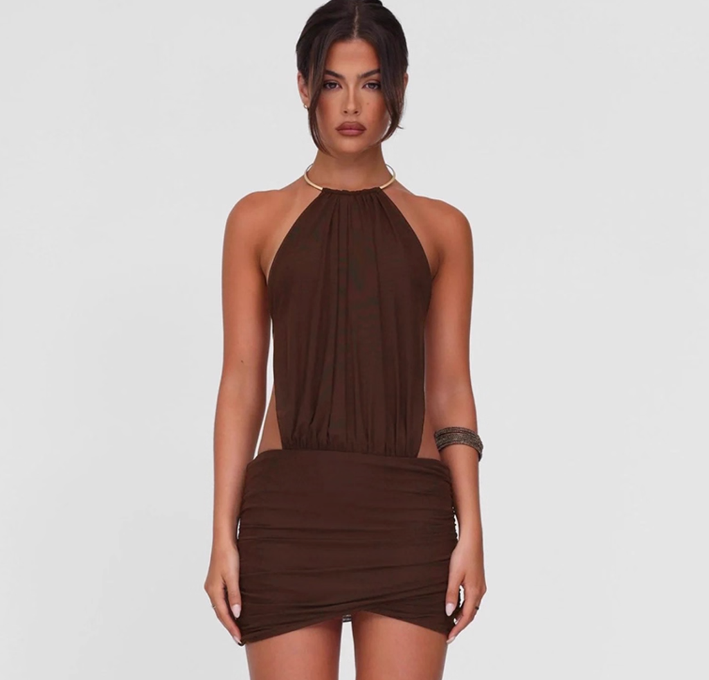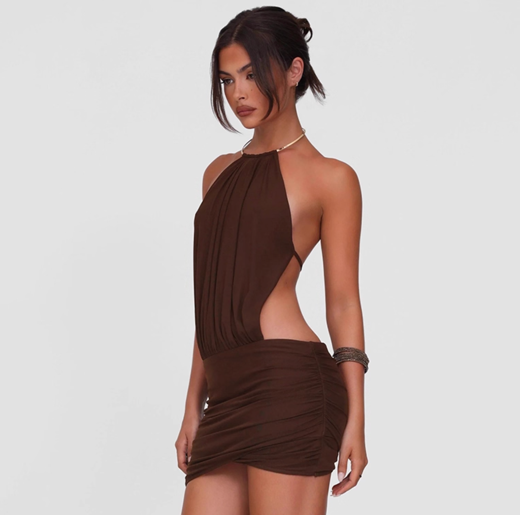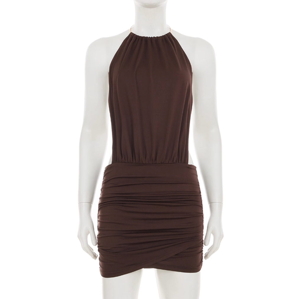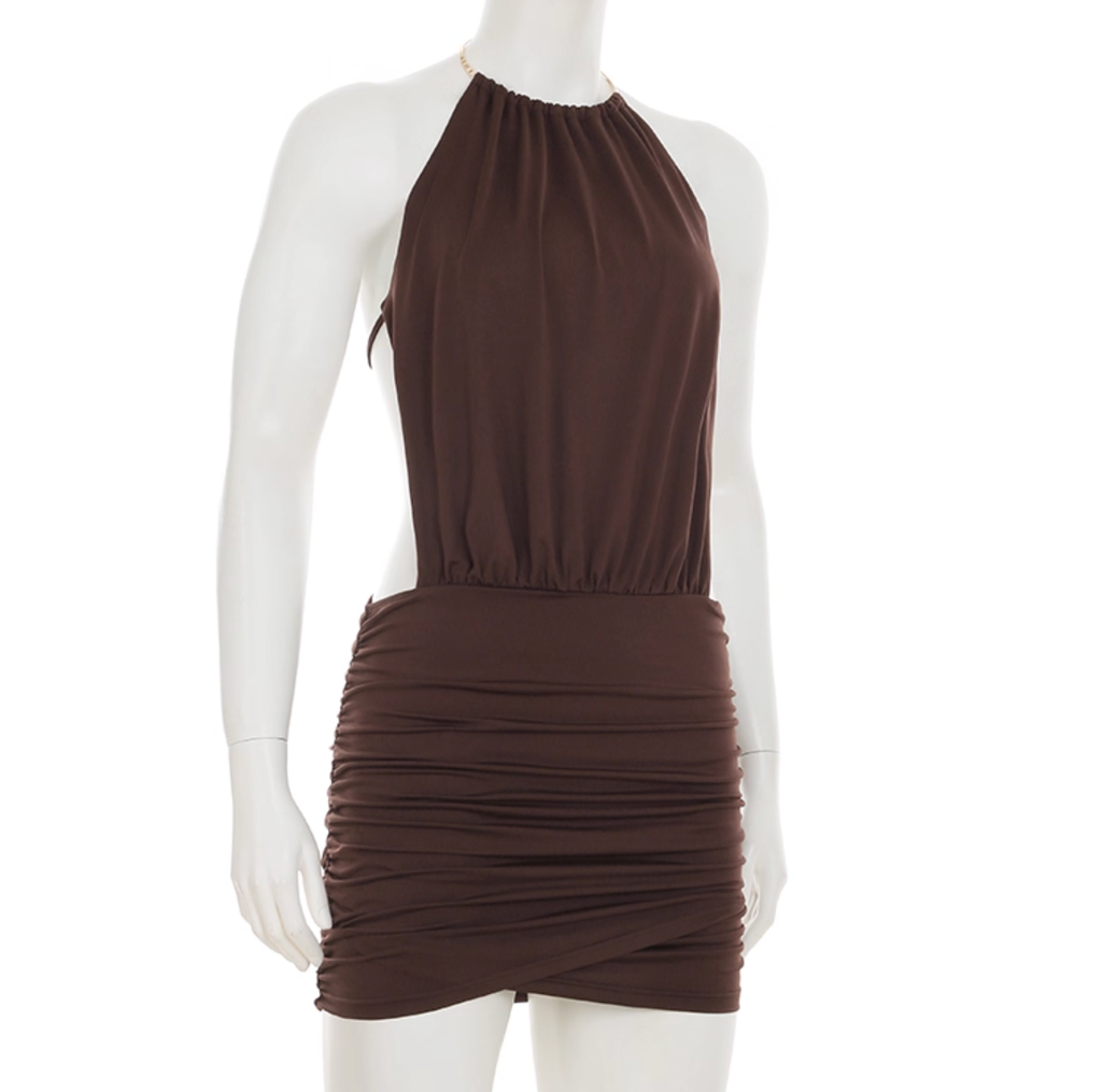 GOLD PLATED WRAP NECK CUT OUT BACK MINI DRESS
