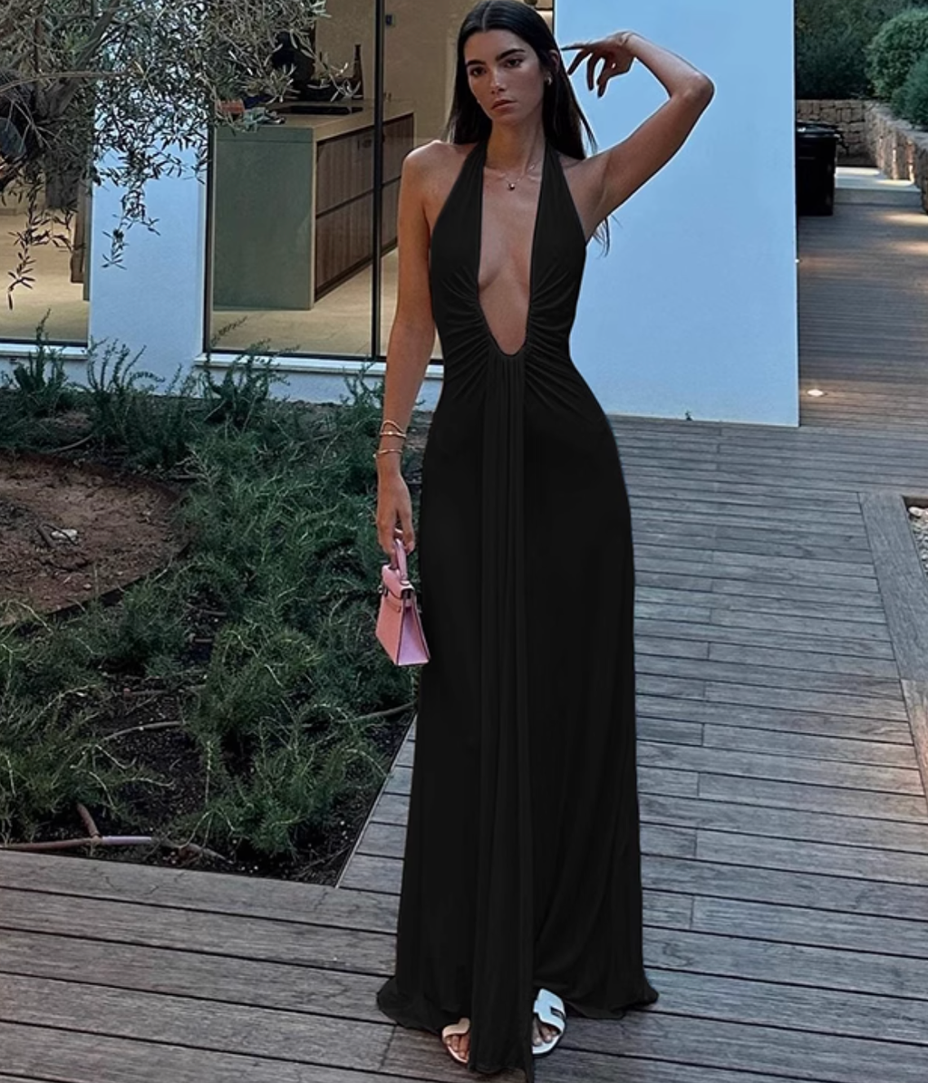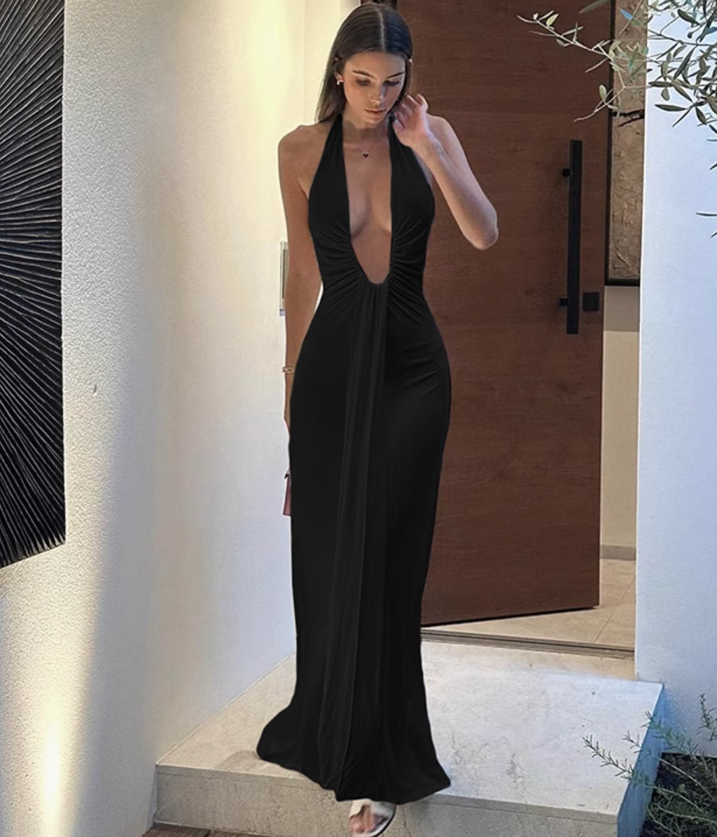 CHEEKY GODDESS RUCHED WRAP NECK MAXI DRESS