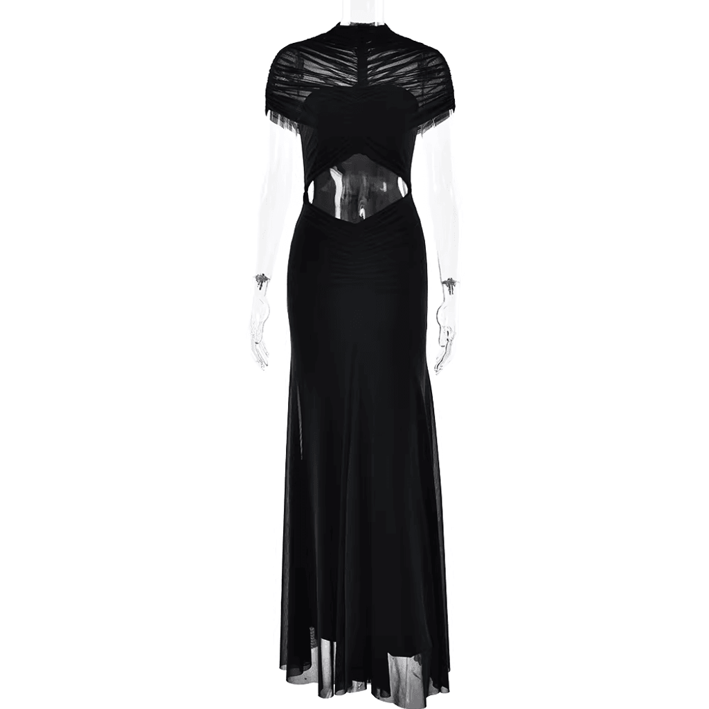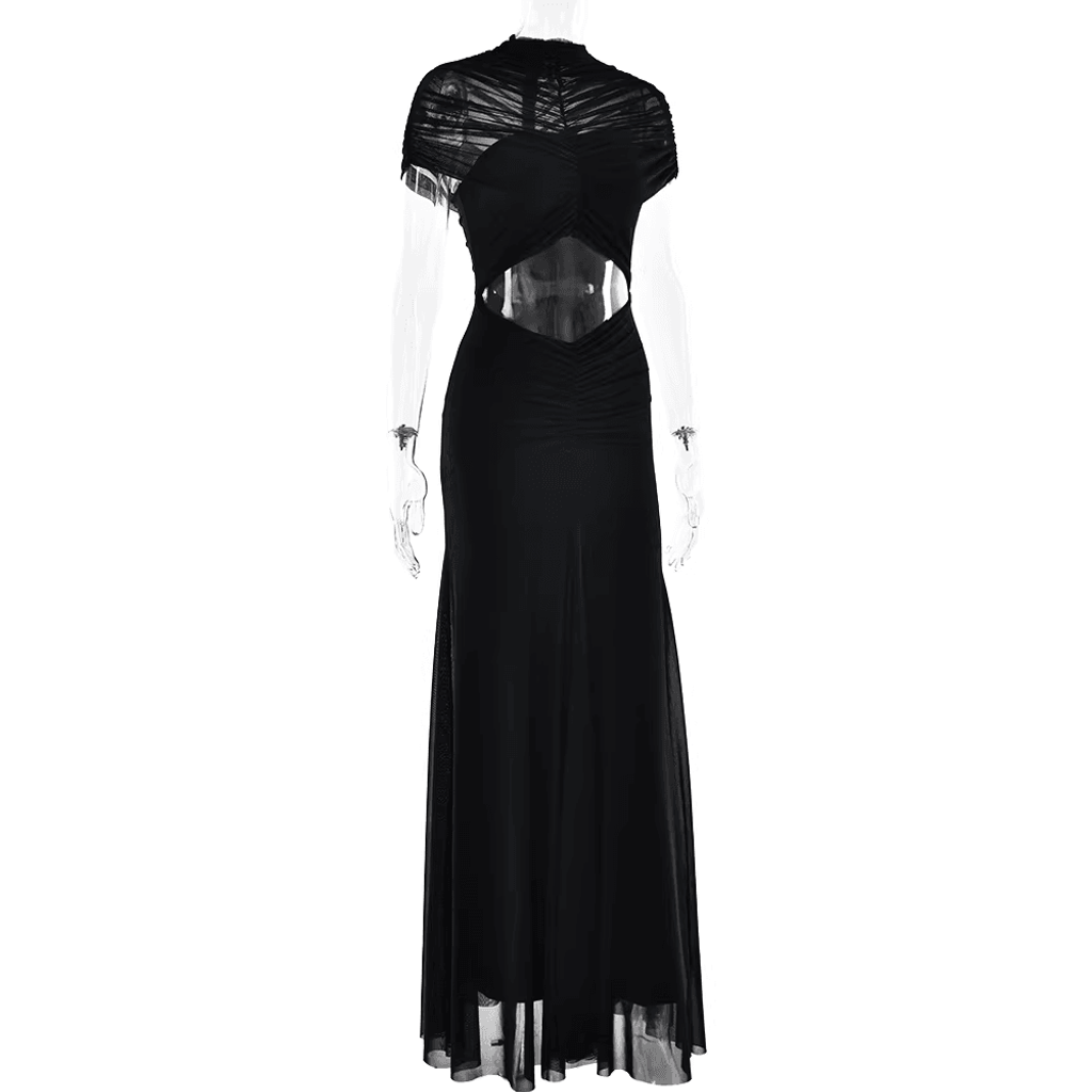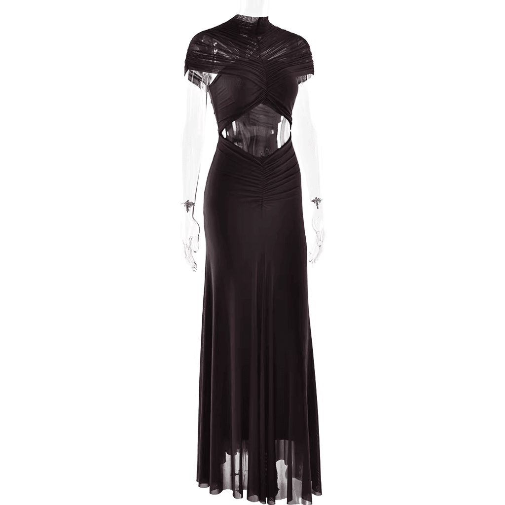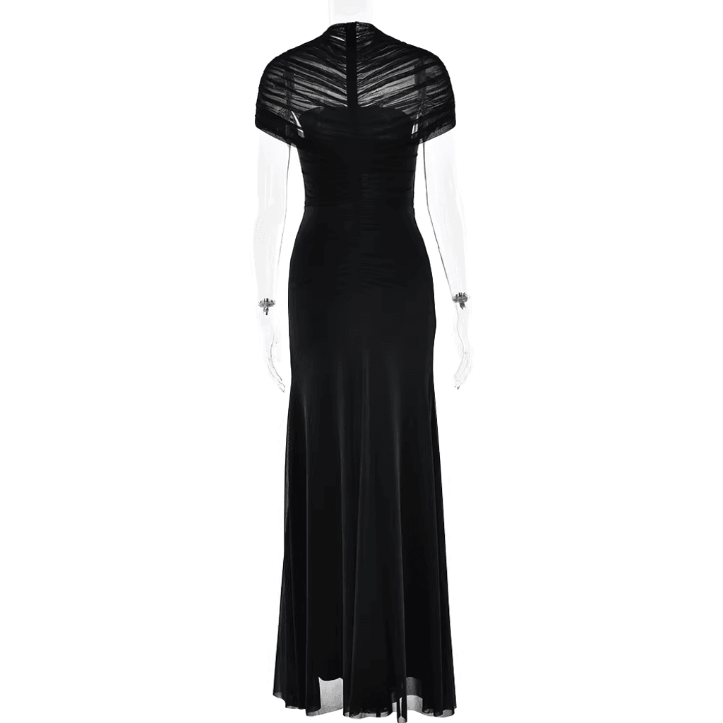 MESH SHOULDER COVER RUCHED MAXI DRESS