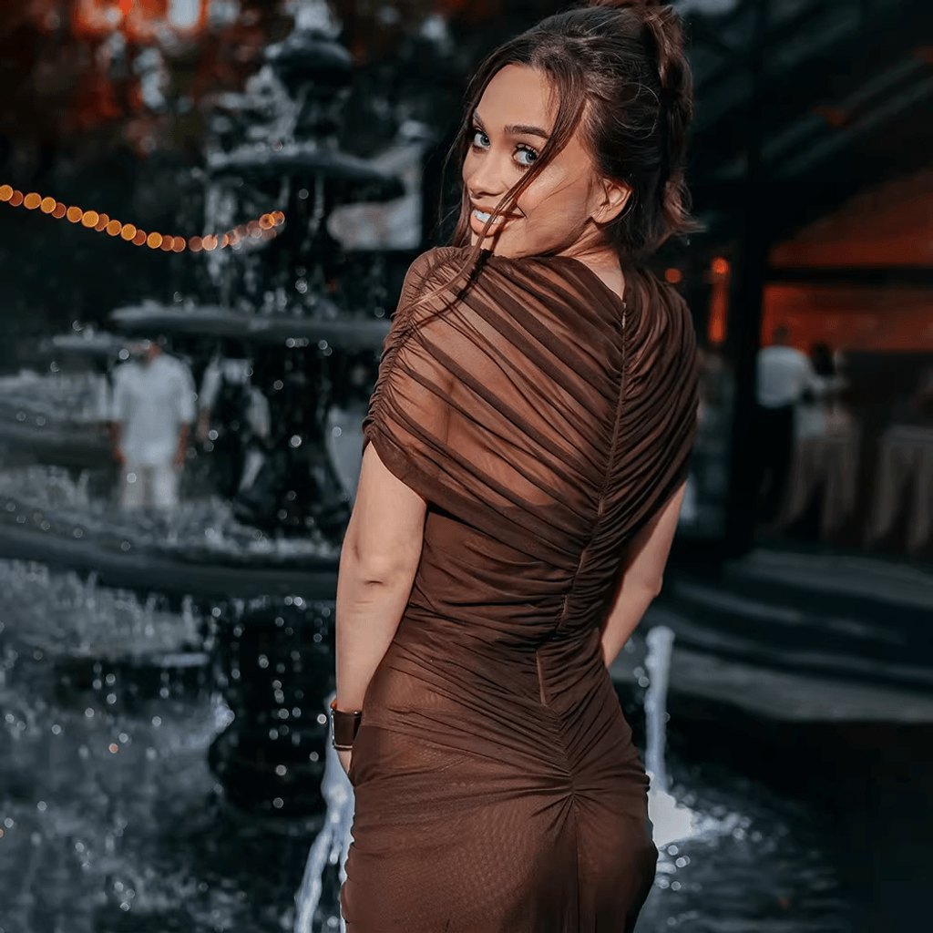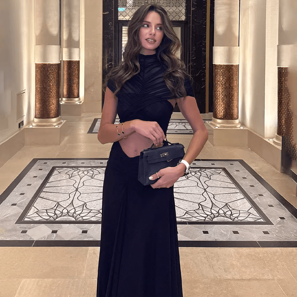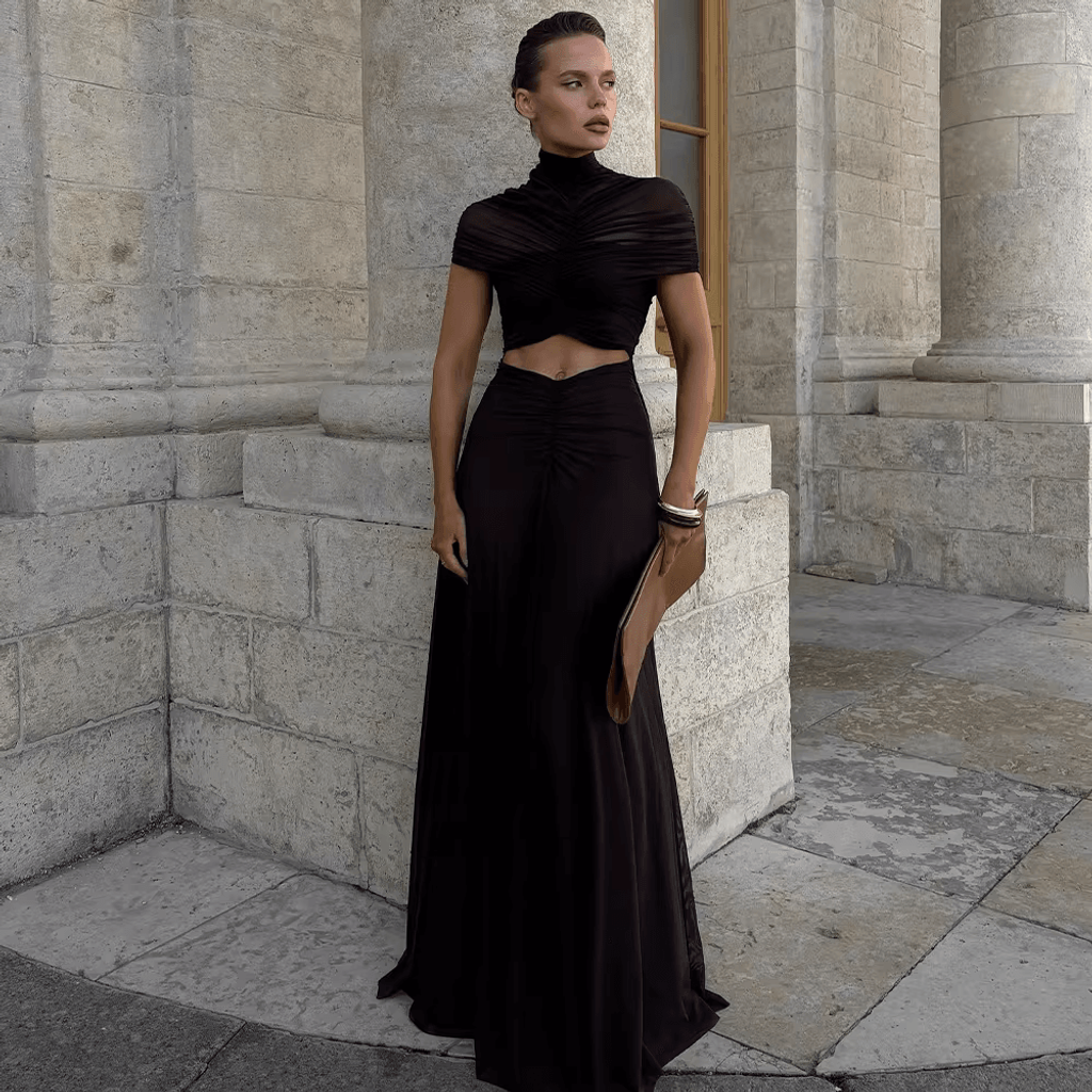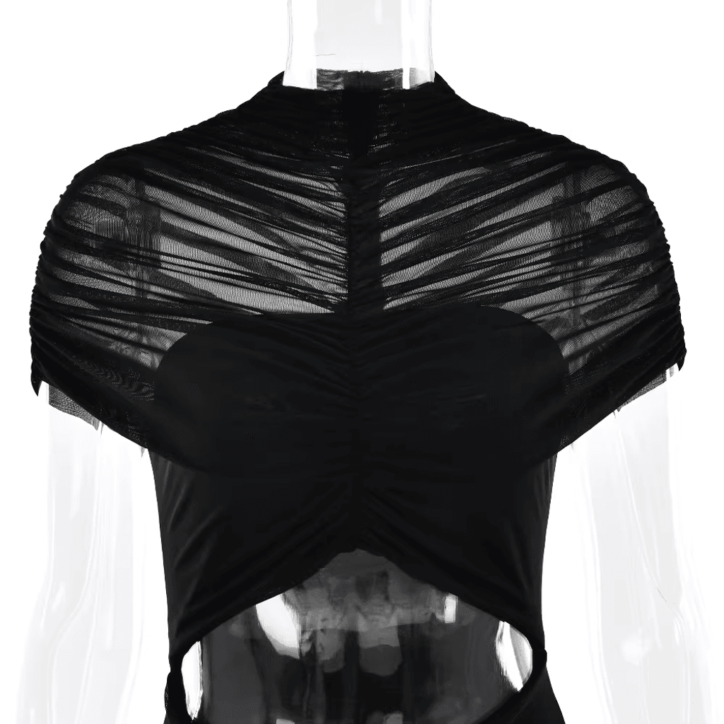 MESH SHOULDER COVER RUCHED MAXI DRESS