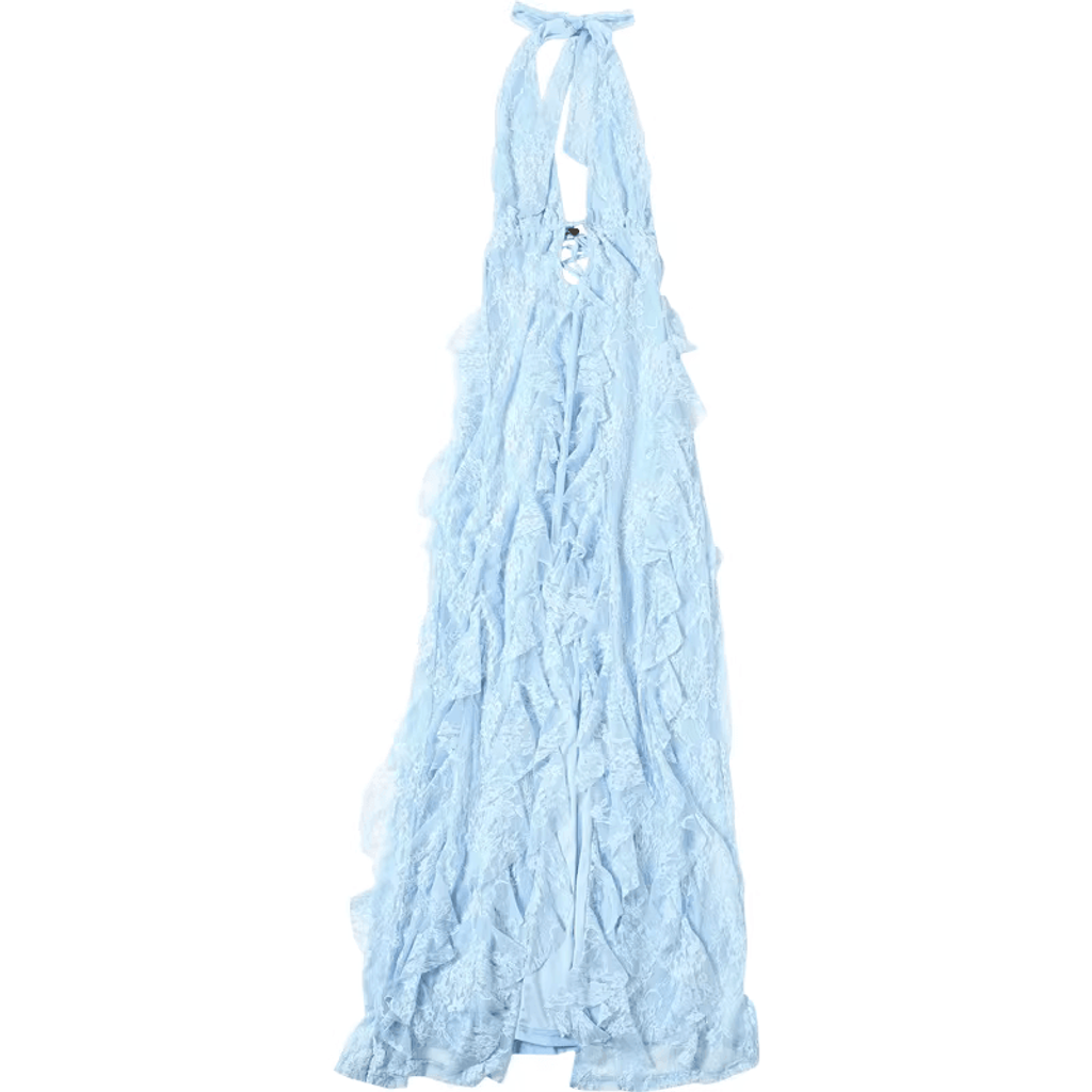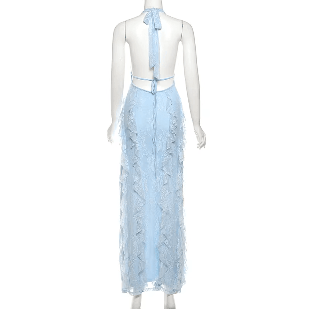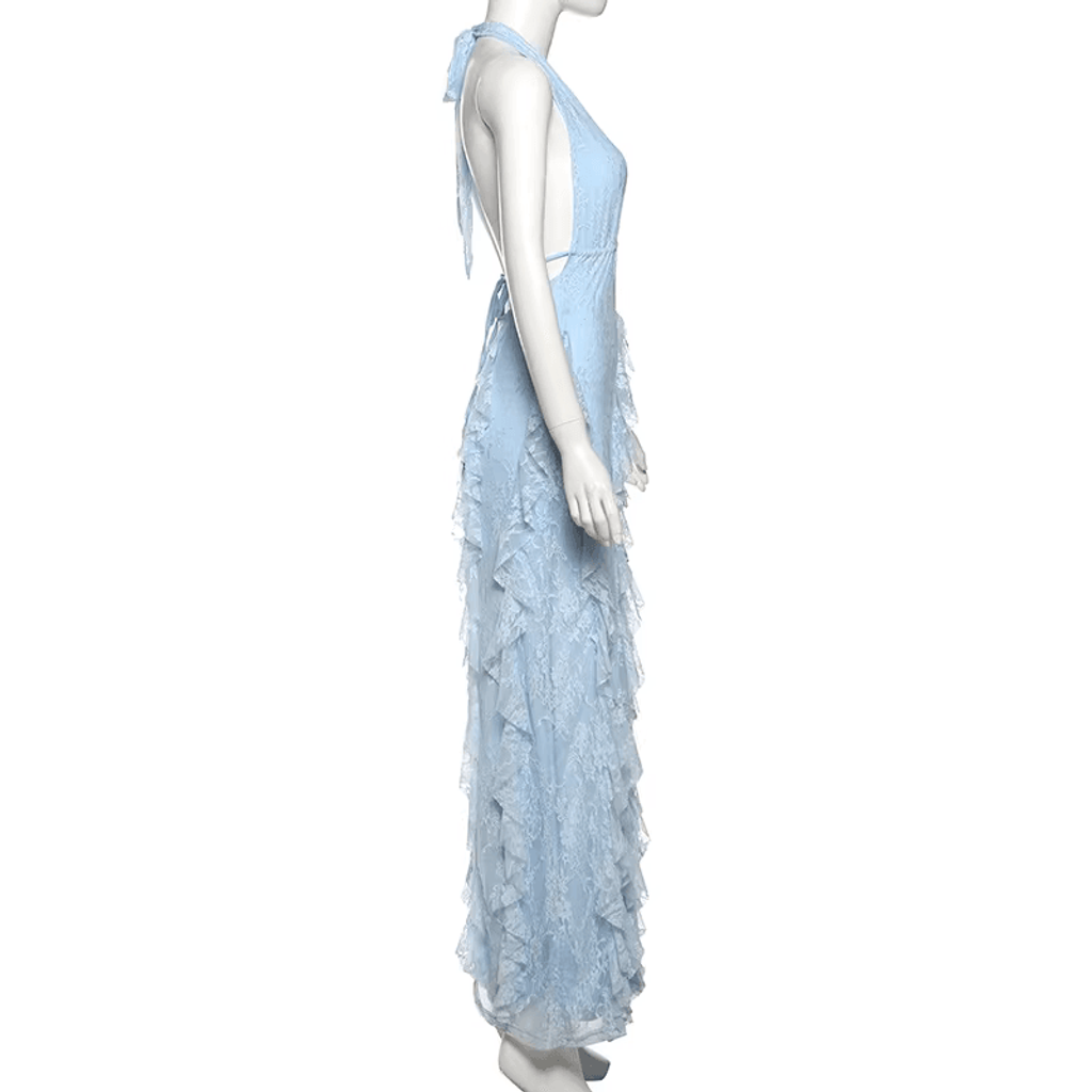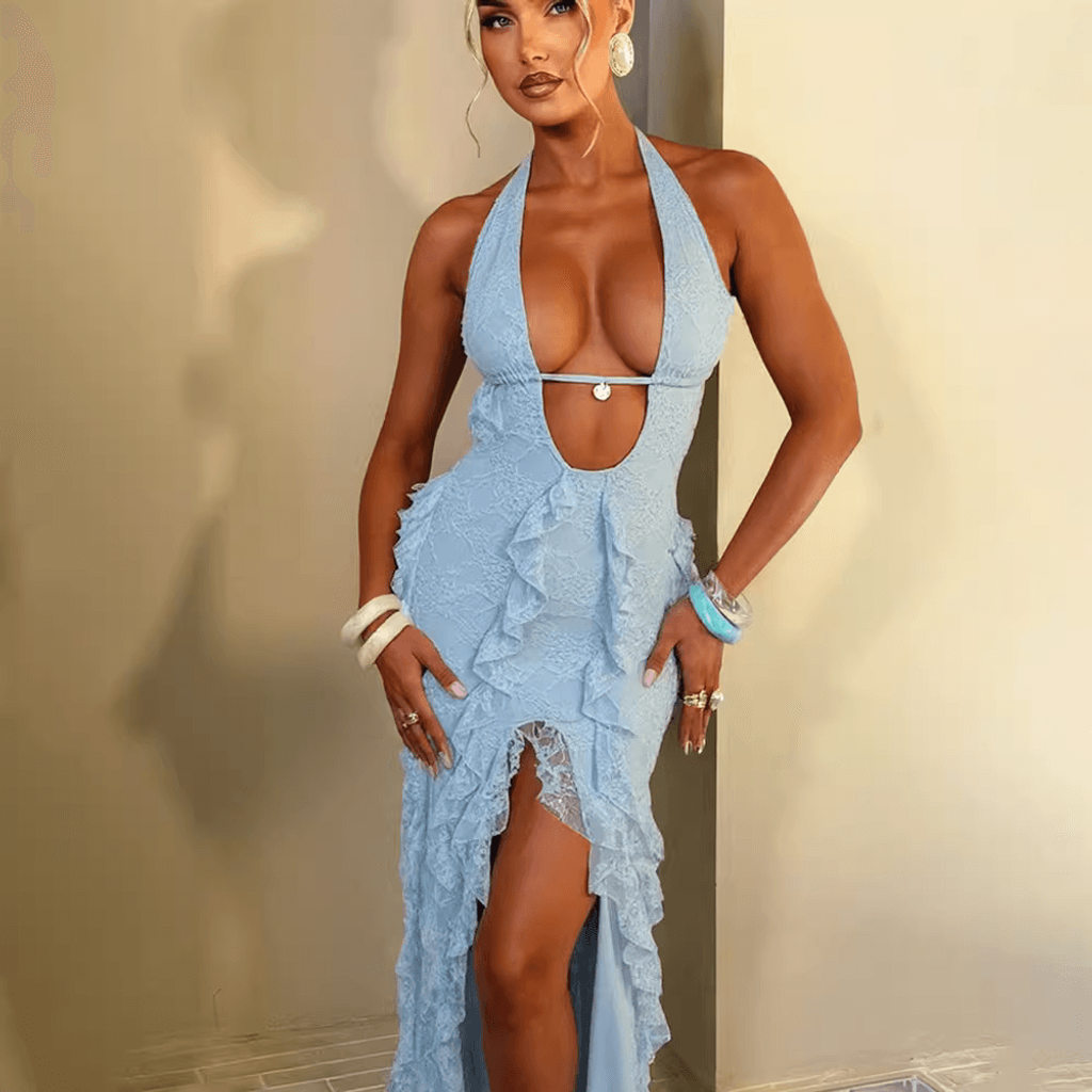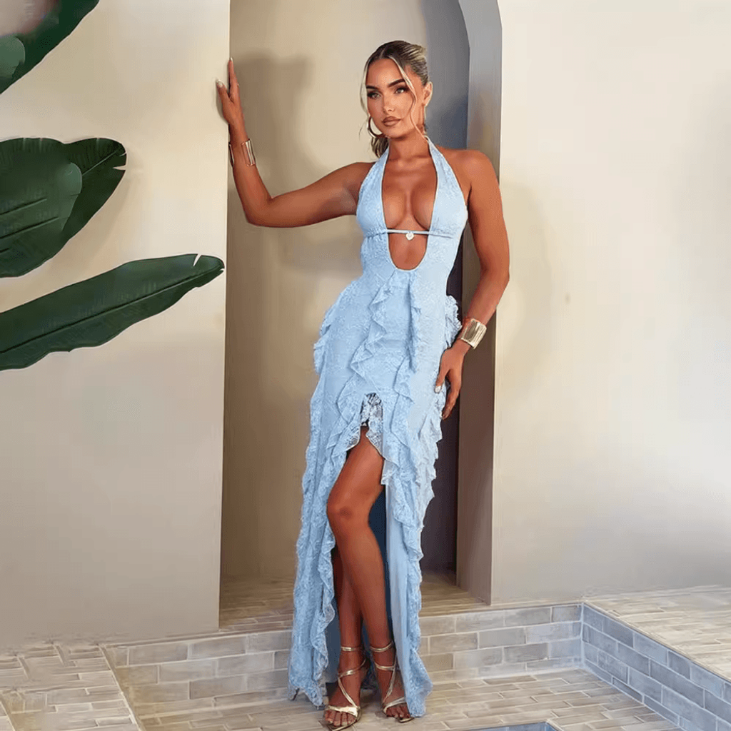 WRAP NECK RUFFLE MAXI DRESS