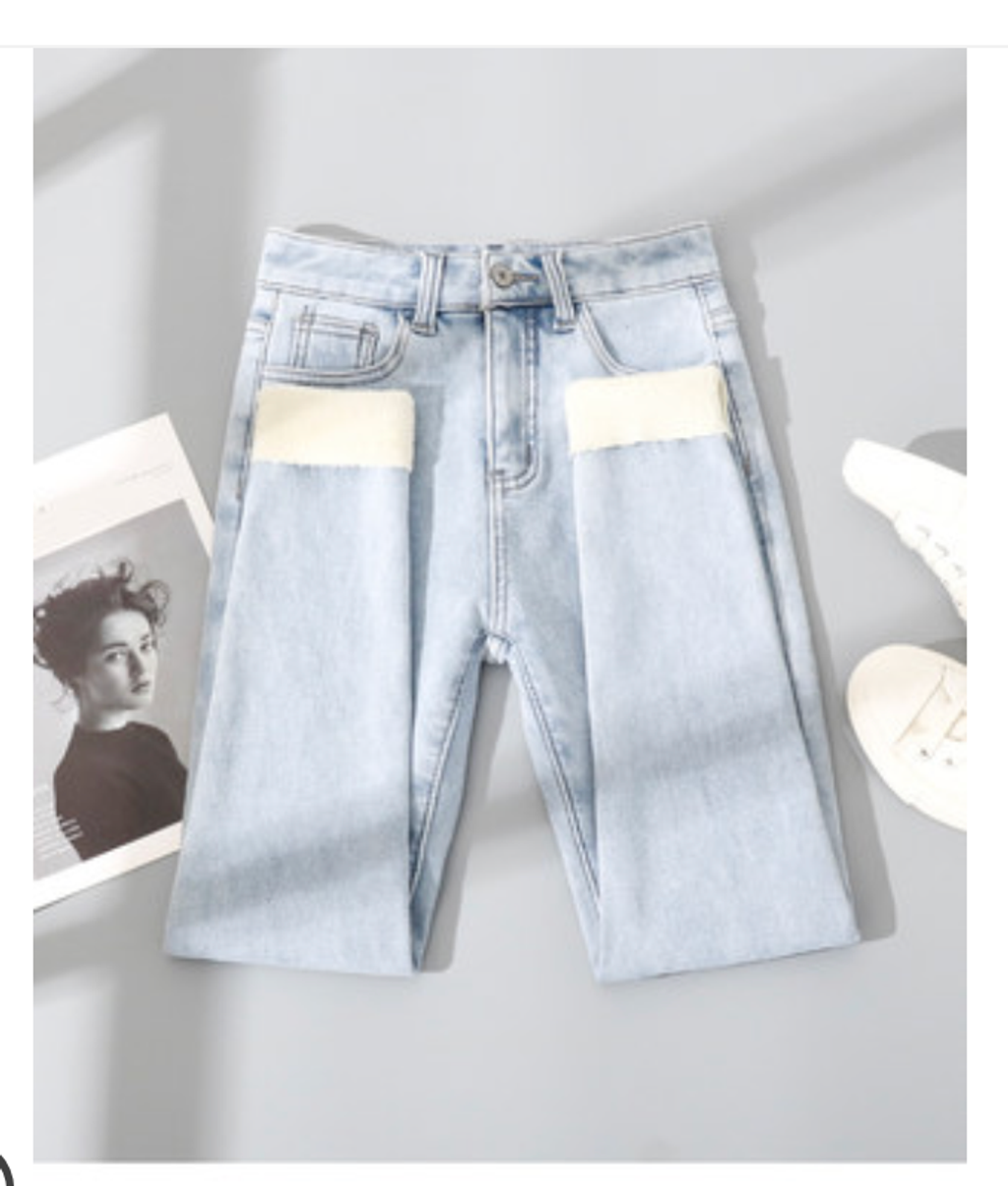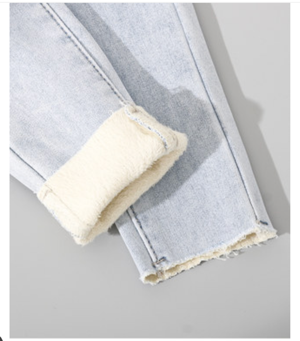 ** * 翹臀毛絨秋冬新款淺藍牛仔直筒褲-超暖有彈性** *