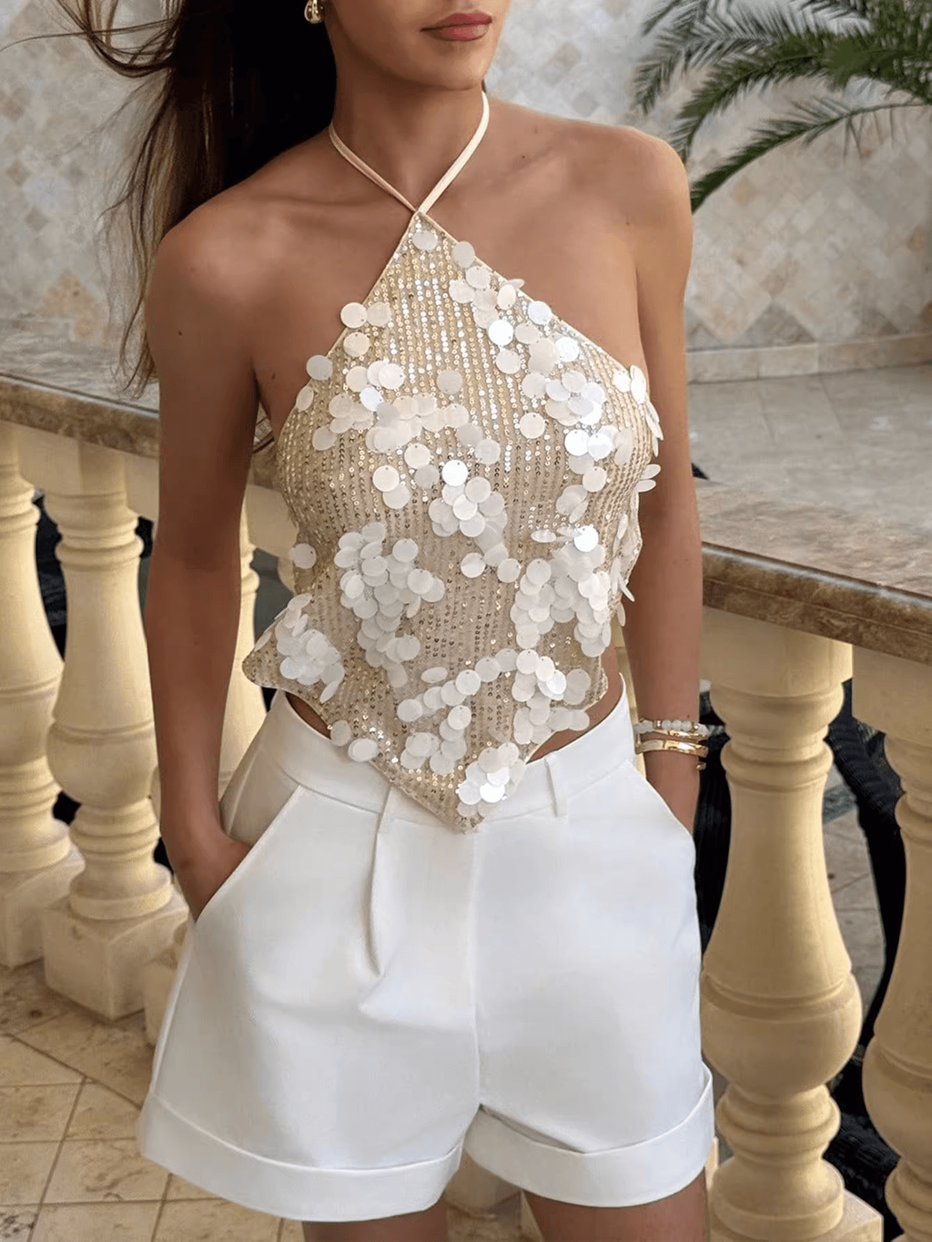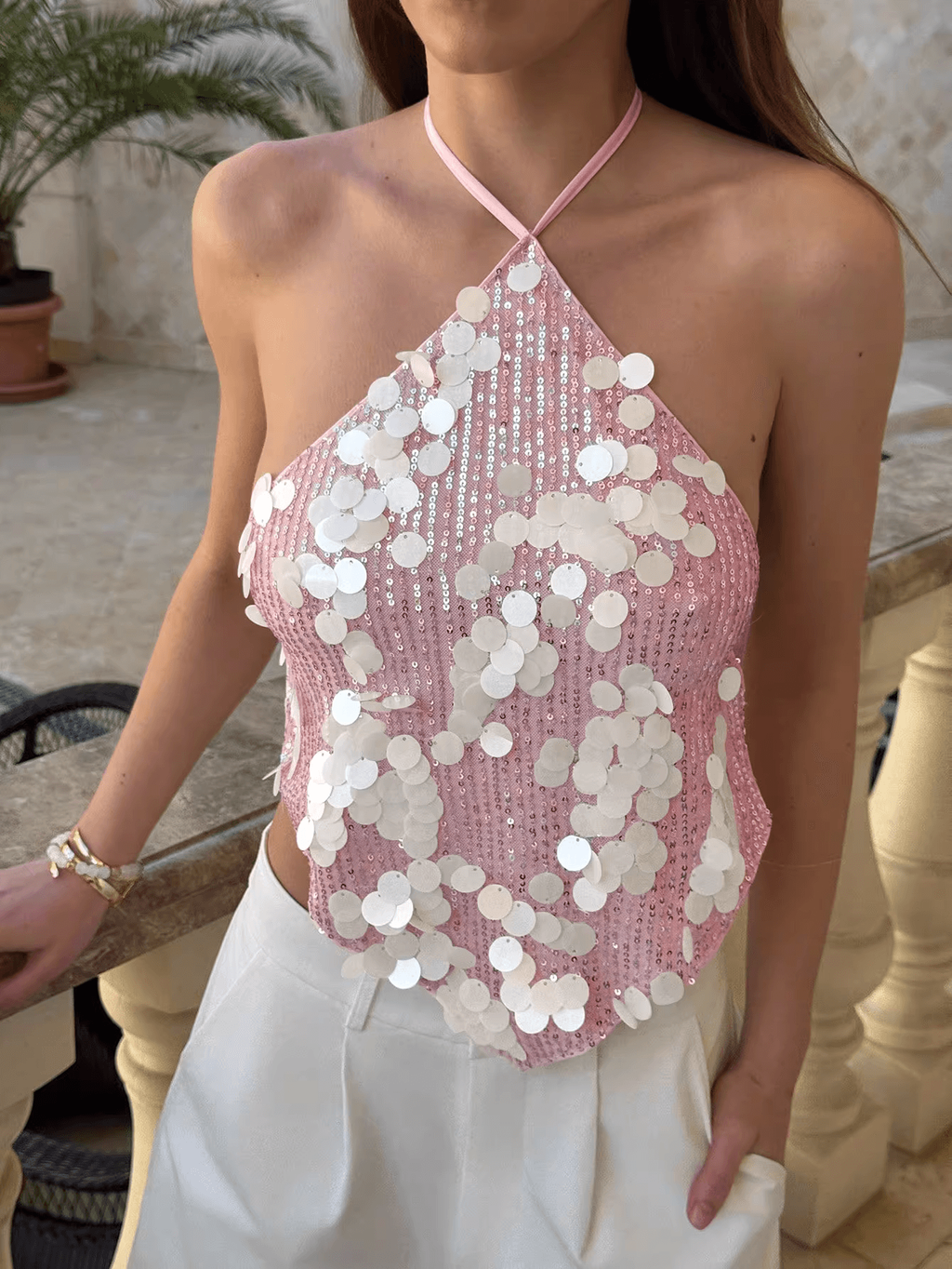 SEQUIN WRAP NECK TOP