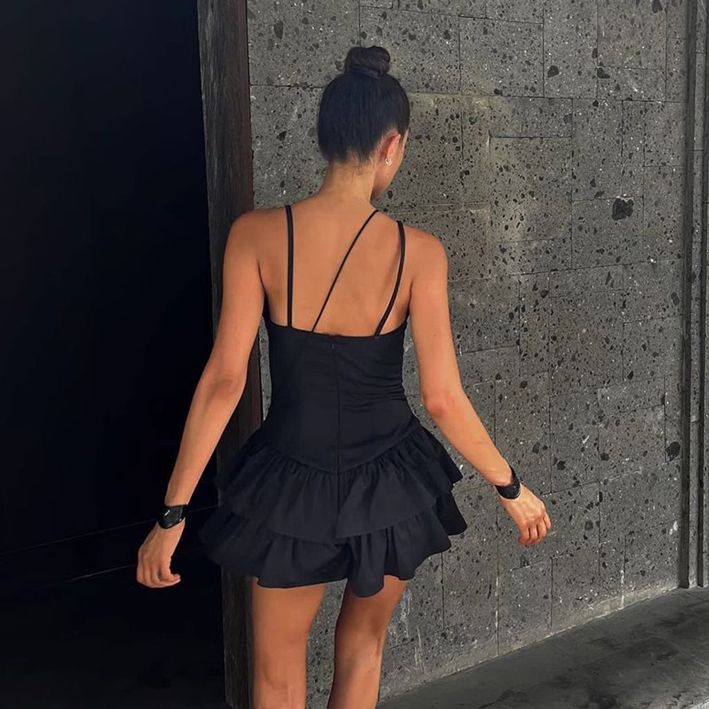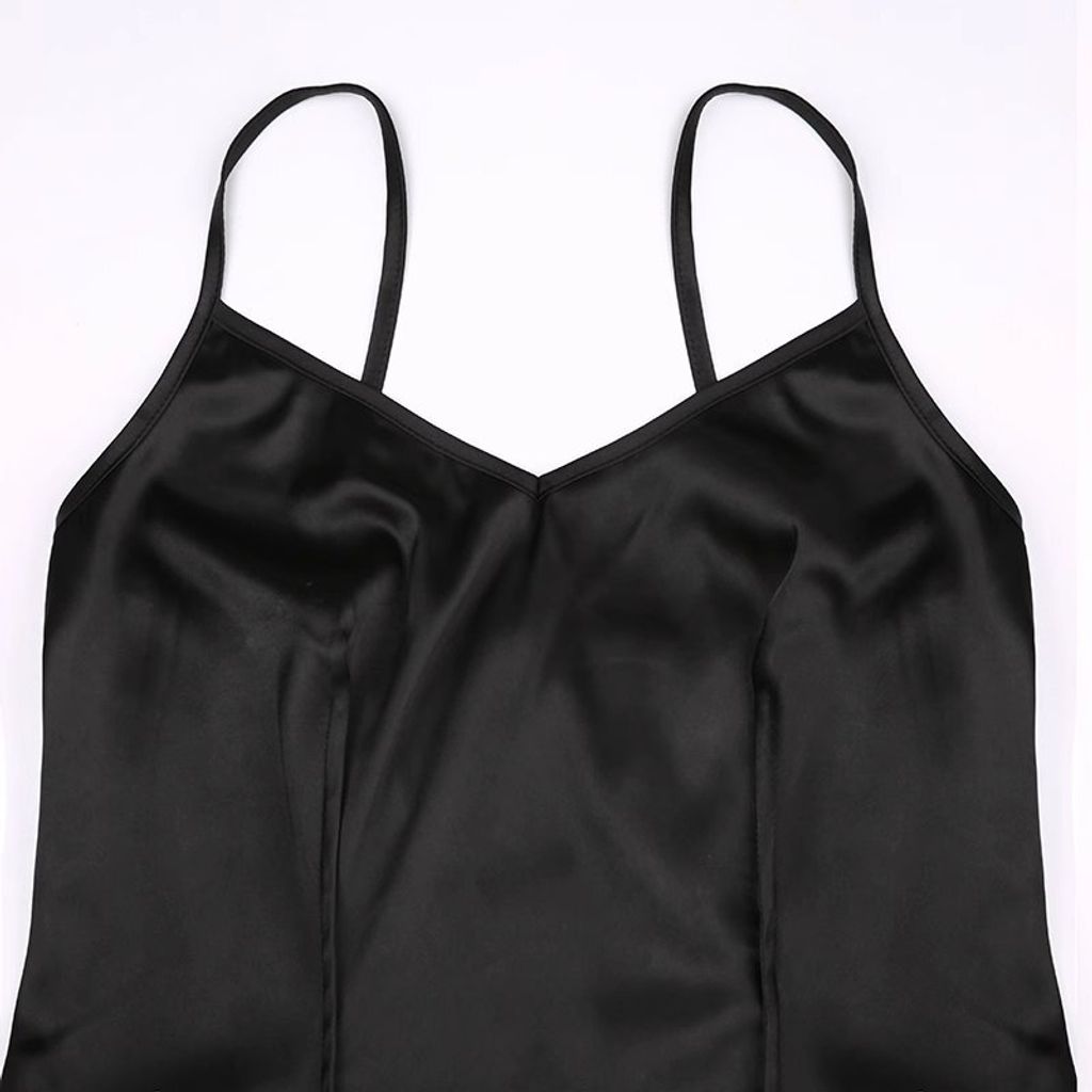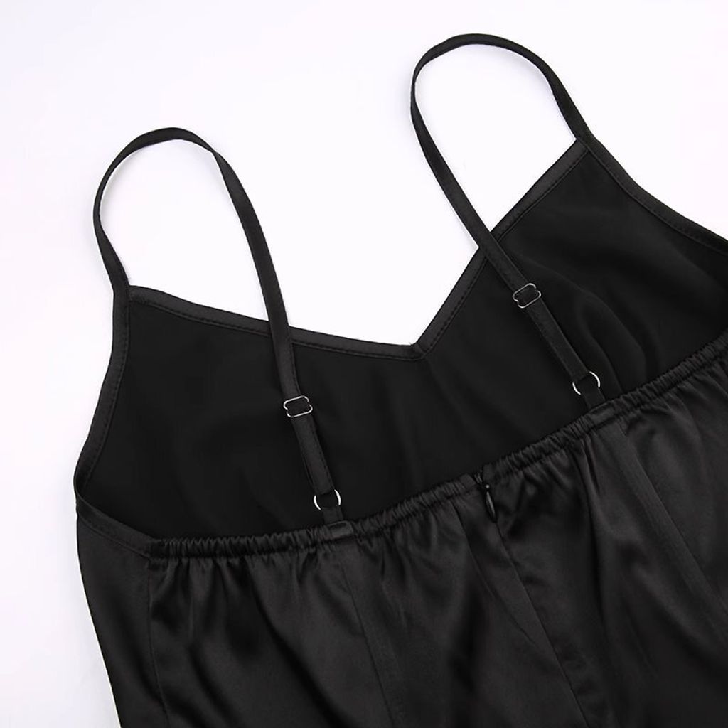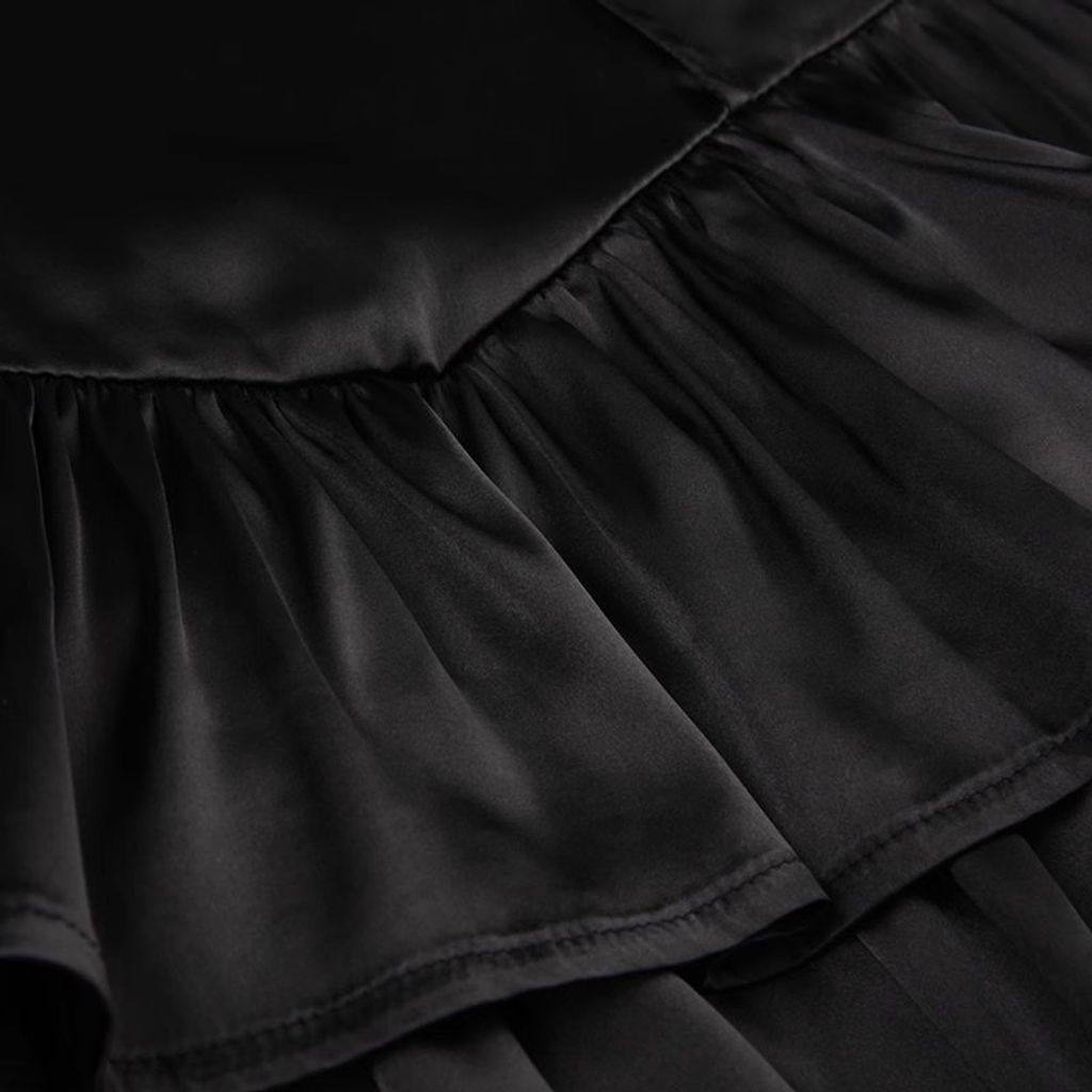 BLACK SATIN CAMI RUFFLE MINI DRESS
