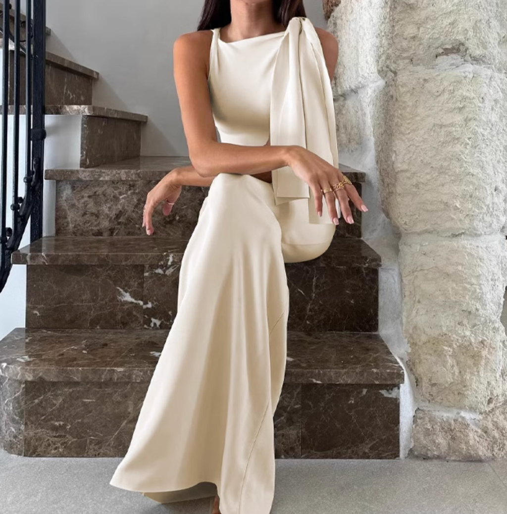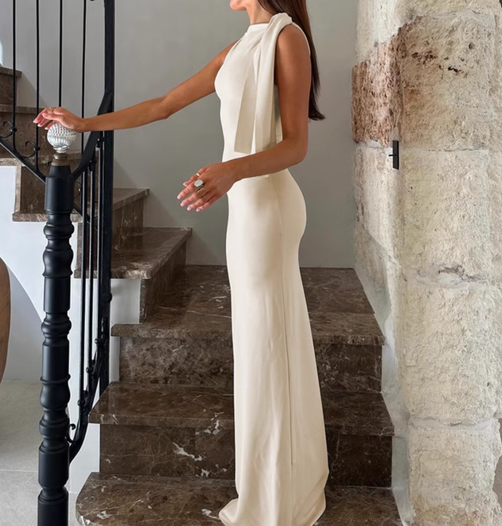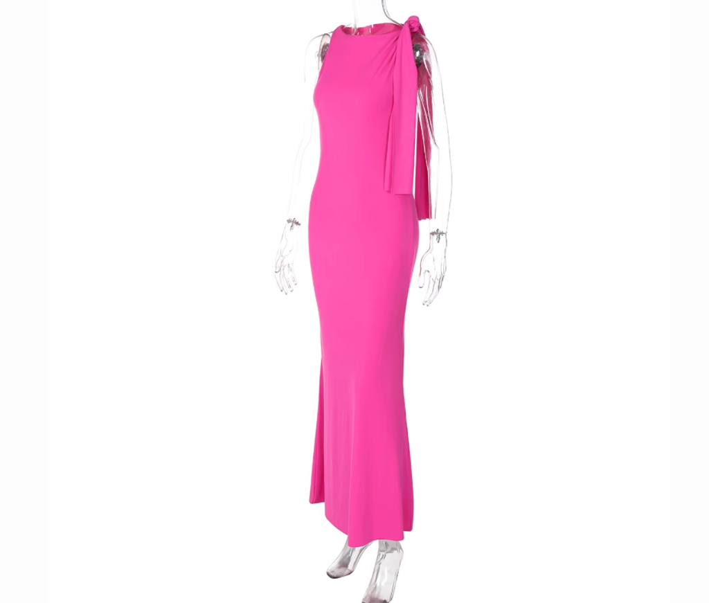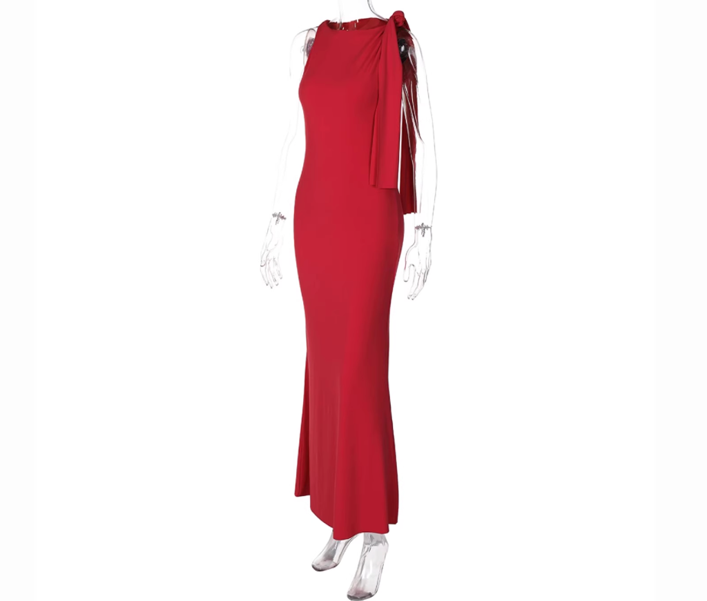 ONE SHOULDER BOW TIE RUCHED SLIT FRONT MAXI DRESS