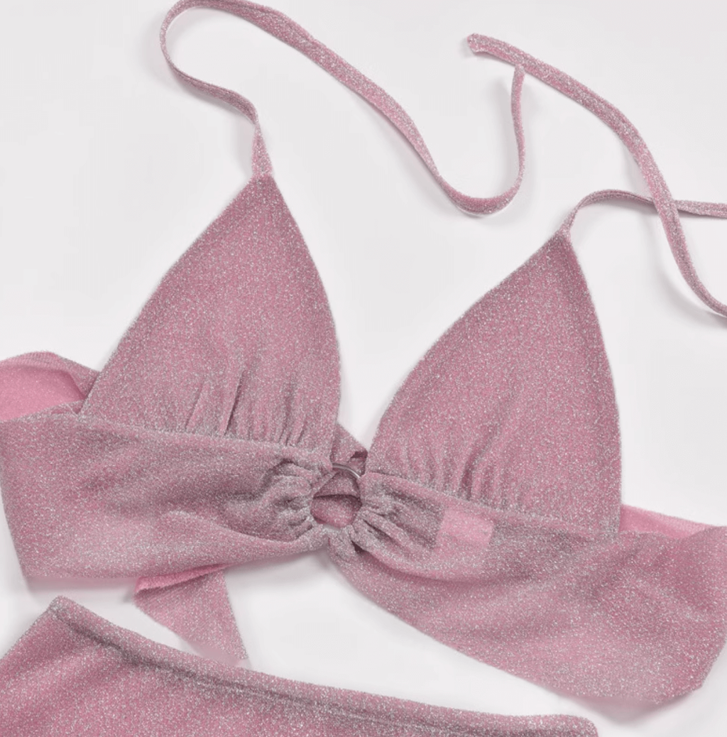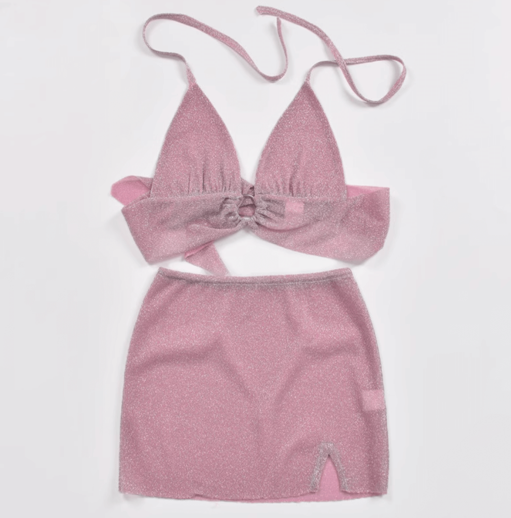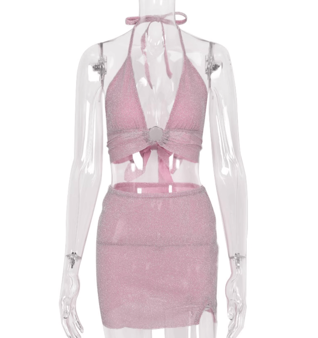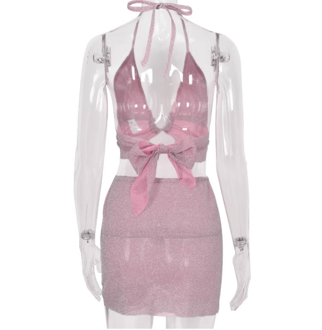 SEQUIN WRAP BUCKLE FRONT WRAP NECK TOP & MINI SKIRT SET