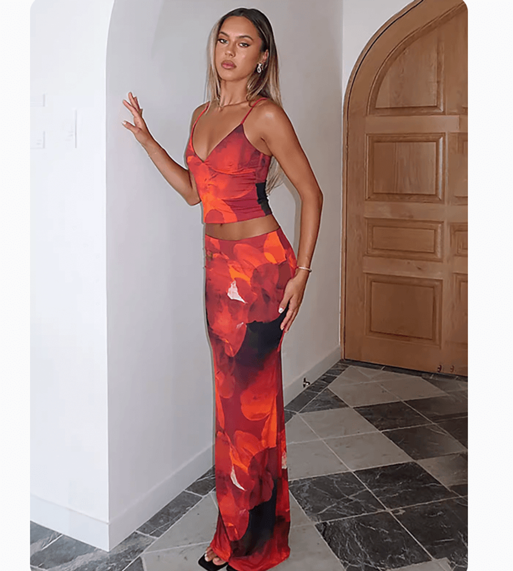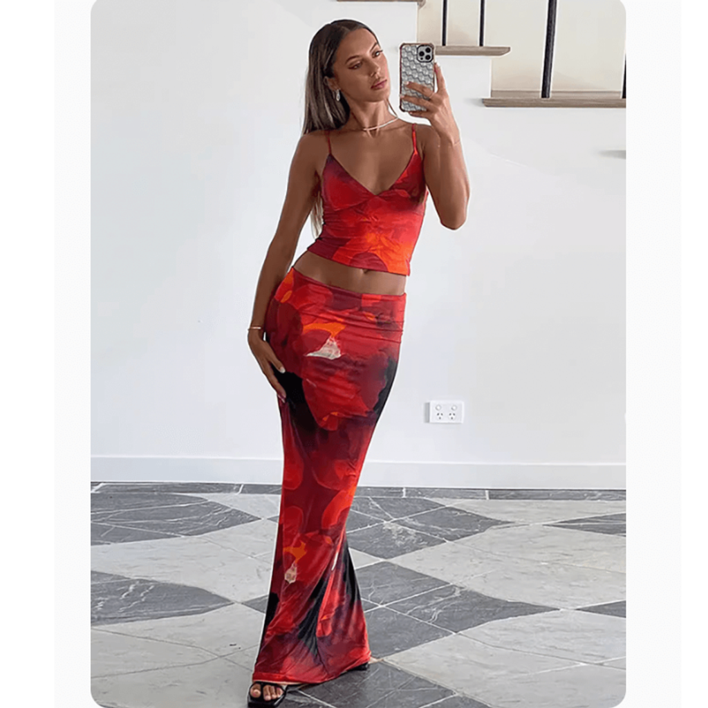 FLORAL RED BEACH VIBE CAMI TOP & MIDI SKIRT SET
