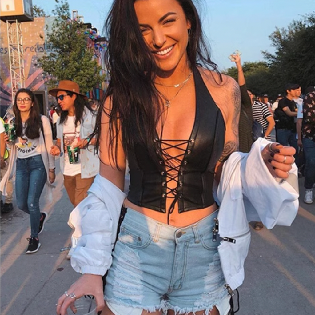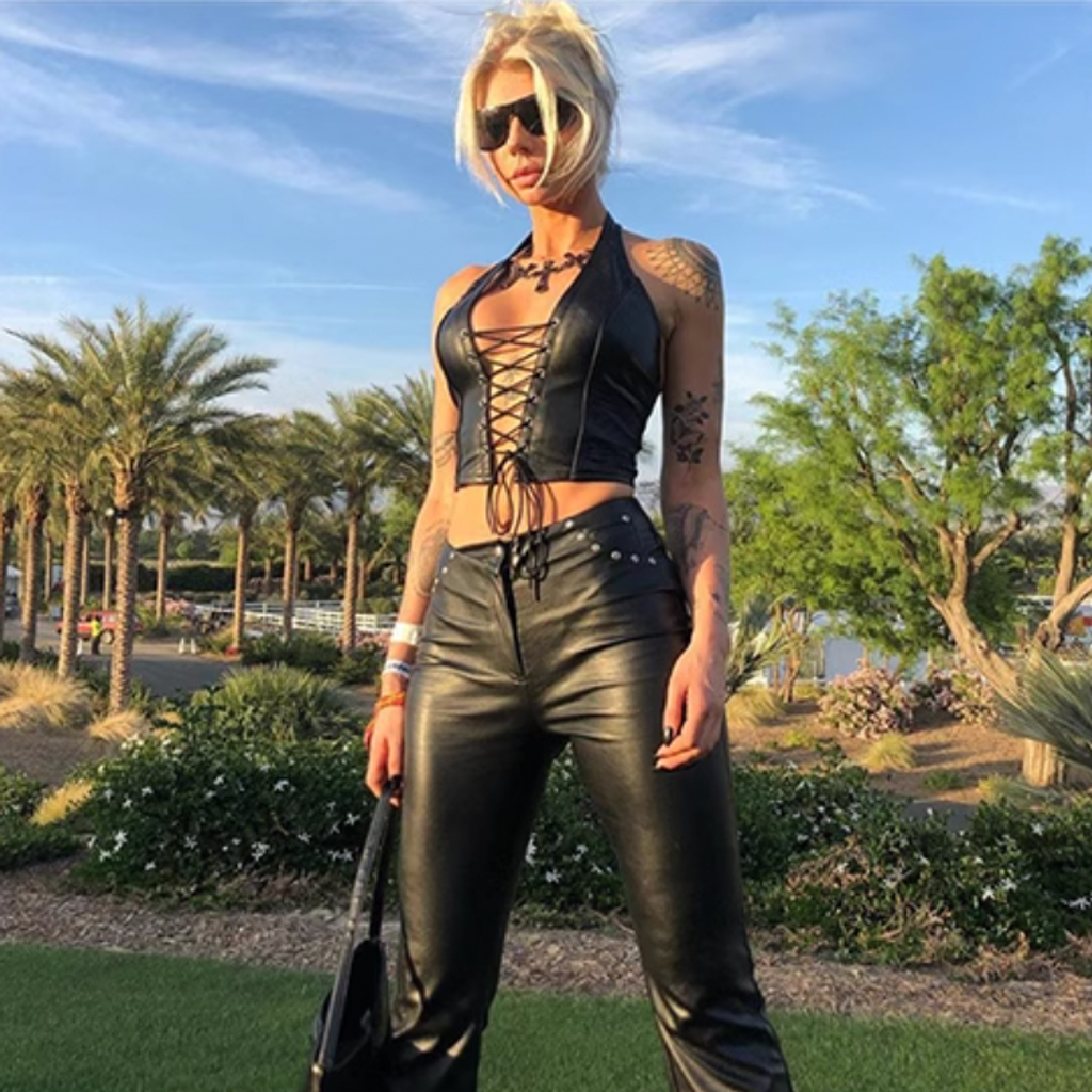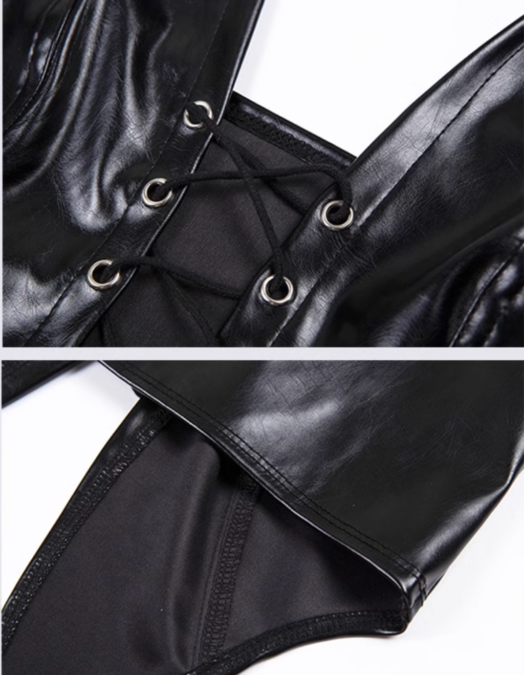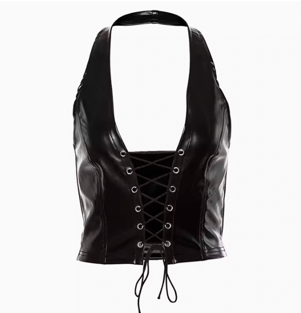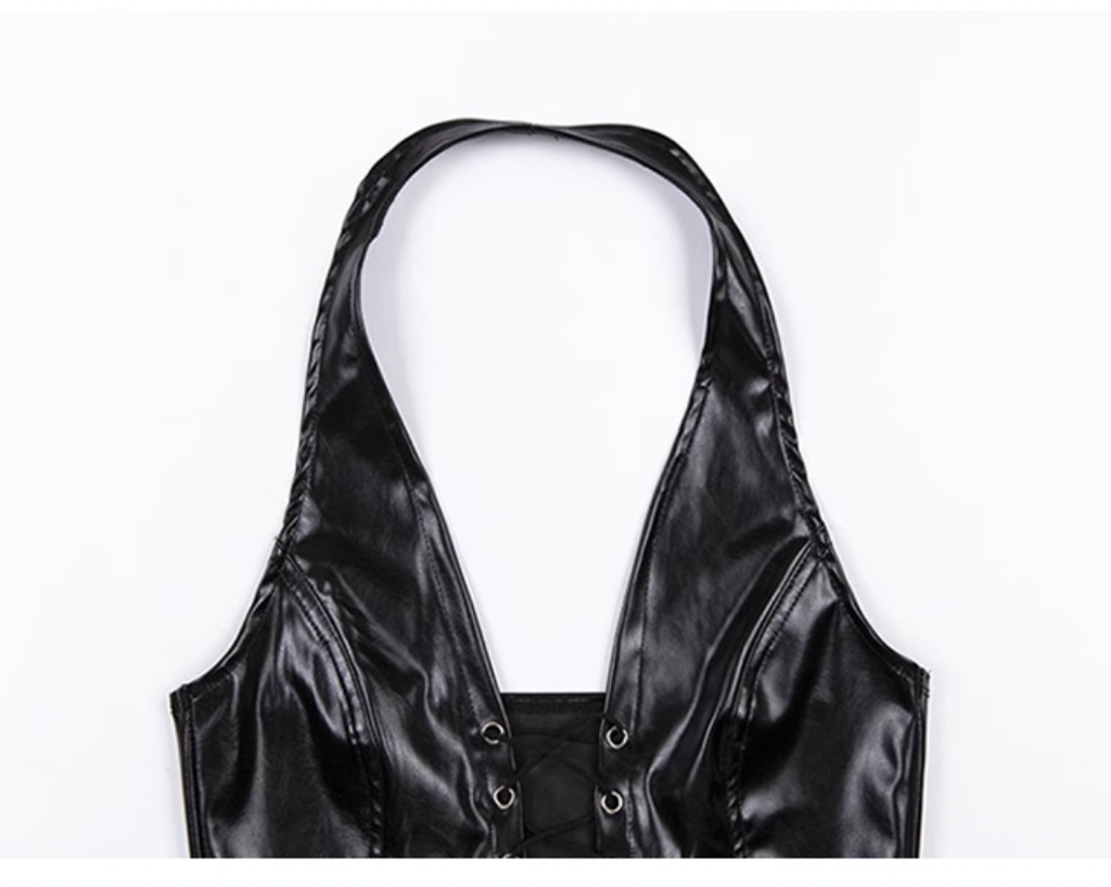 TIE UP WRAP NECK FAUX LEATHER TOP